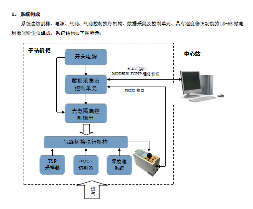 系統由切割器、電源、氣路、氣路控制執行機構、數據采集及控制單元、具有濕度修正功能的LD-6S微電腦激光粉塵儀組成。
