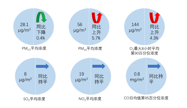 4月,全國339個地級及以上城市PM2.5平均濃度為28.1微克/立方米,同比下降0.4%;PM10平均濃度為56微克/立方米,同比上升5.7%;O3平均濃度為144微克/立方米,同比上升4.3%;SO2平均濃度為8微克/立方米,同比持平;NO2平均濃度為19微克/立方米,同比持平;CO平均濃度為0.8毫克/立方米,同比持平。