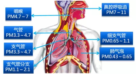 它不易被阻擋,被吸入人體后會直接進入支氣管,沉積肺部,甚至可以進入肺泡、血液。在肺部沉積率高的是粒徑為1微米左右的顆粒物。這些顆粒物在肺泡上沉積下來,損傷肺泡和粘膜,引起肺組織的慢性纖維化,導致肺心病、加重哮喘病、引起慢性鼻咽炎、慢性支氣管炎和心血管病等方面的疾病,嚴重的可危及生命,對兒童和老年人的危害尤為明顯。