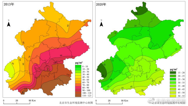(圖8 2013年、2020年北京市PM2.5濃度空間分布)